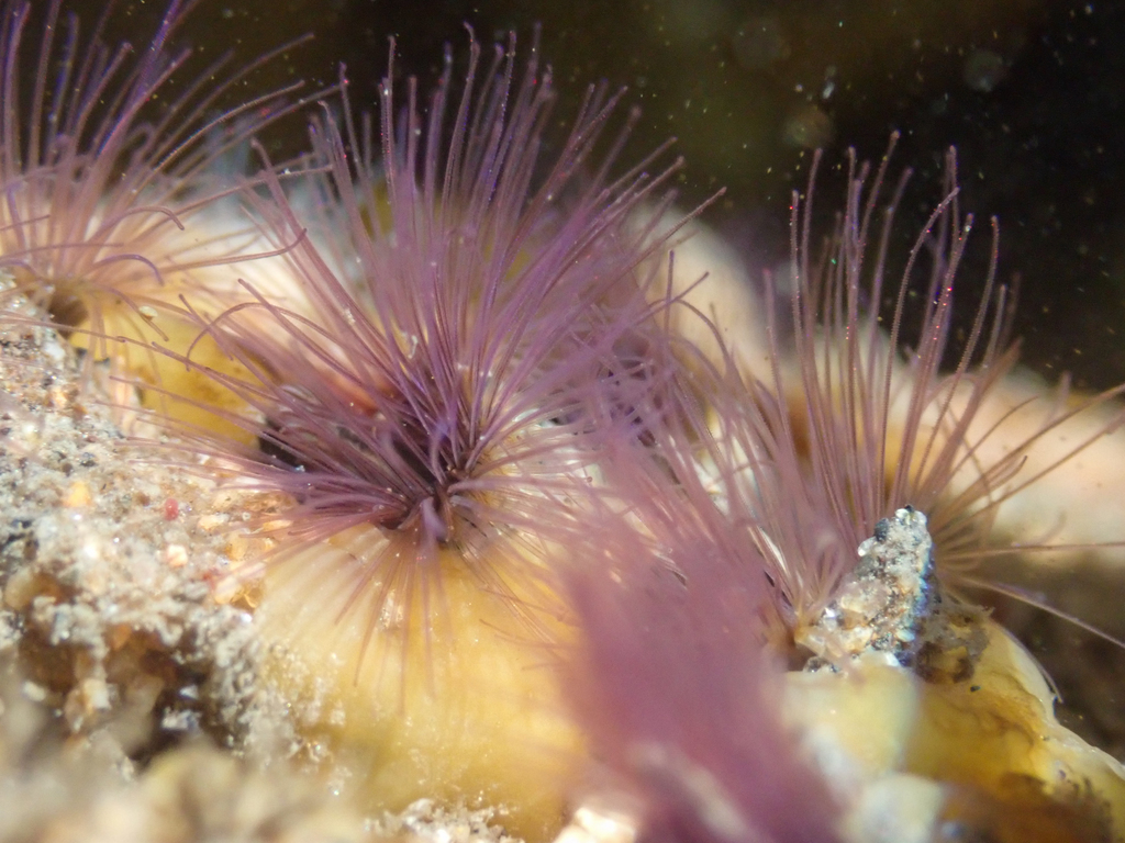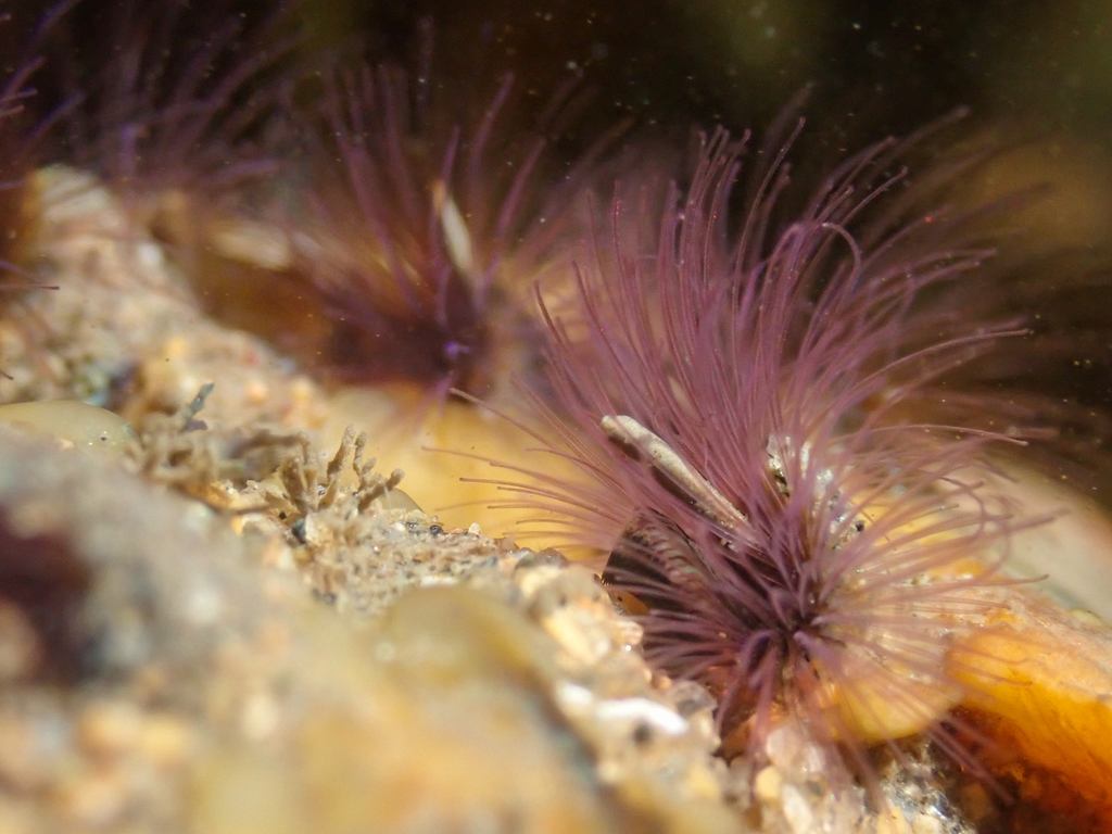 As the tide recedes the worms conceal themselves down in their tubes. But oooo when that tide comes back, those gorgeous lavender colored tentacles come out to catch a meal. Not only is food particles captured, but sand also! The sand grains are sorted to fit the needs of the tube, to fill holes or build upon the existing tube. The remaining sand grains are tossed out, tootles!