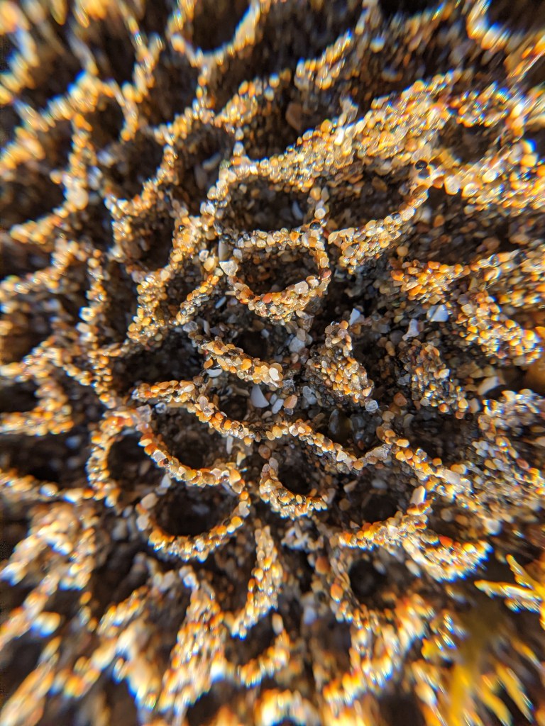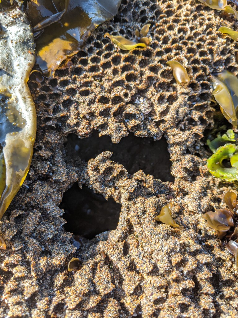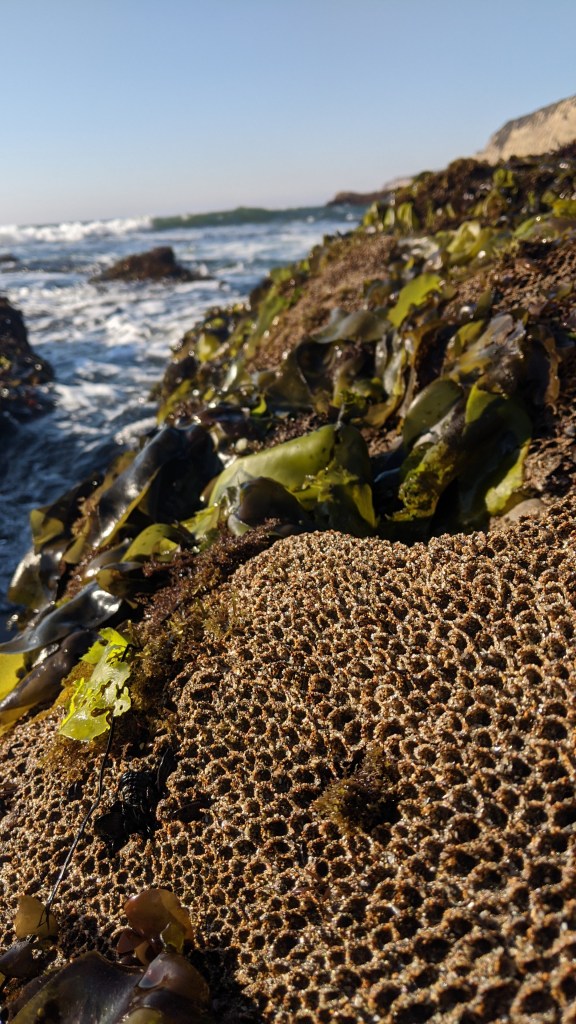 This week’s post was inspired by this repeating pattern I’ve seen recently while tidepooling, but hadn’t investigated yet. The culprit/artist/architect is the California Sandcastle Worm! Also known as the ‘honeycomb worm,’ or ‘honeycomb tube worm,’ you can find this interesting creature from mid to North California down to Baja California.