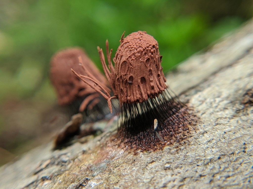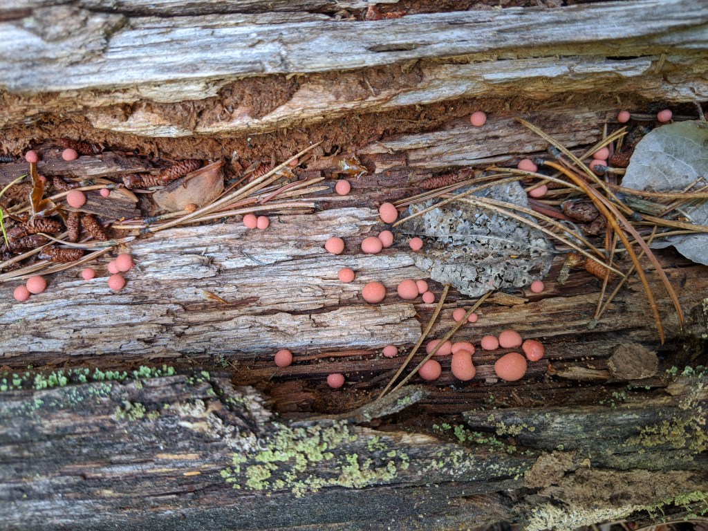 Surrounding the swamp’s edge was a great moose trail with lots of decomposing logs that fungi and slime molds were growing and thriving on. Pictured above are three genera of slime molds I found, which all belong to the Kingdom Protozoan, not in the Fungi kingdom to which mushrooms are taxonomically placed. Wolf’s milk when in its immature fruiting body stage like above, is like a pimple waiting to be popped. It’s near impossible for me to NOT pop one of its irresistibly squishy blobs. All three grow on rotting woody material, and some have an affinity for larger stumps or logs. But unlike the other two Chocolate Tube Slime elevates itself off the substrate by its skinny little stalks. It also goes by the common name Tree hair and Pipe Cleaner Slime. The tiny chocolate sausages is called the sporangia which produces the spores. Ah, just love her.