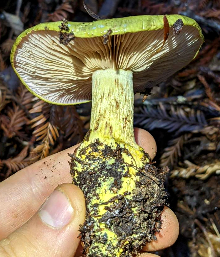 Just look at that almost neon, chartreuse yellow-green coloration, wow! Even though it has no special odor or taste, the highlighter-esc color on the cap and stipe makes this mushroom quite distinct. While we found it under Tanoak, but it is usually found under Coast Live Oak.