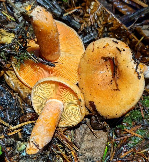 As a Lactarius, it exudes a liquid-like substance known as latex when young gills are sliced. The color is a key identifying feature, appearing bright orange, like a sickly orange halloween candy you try to trade with your younger sister for some lemon heads.