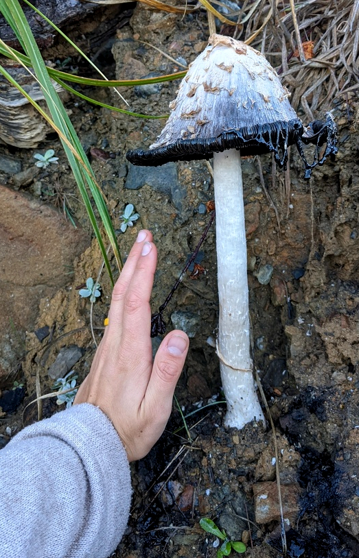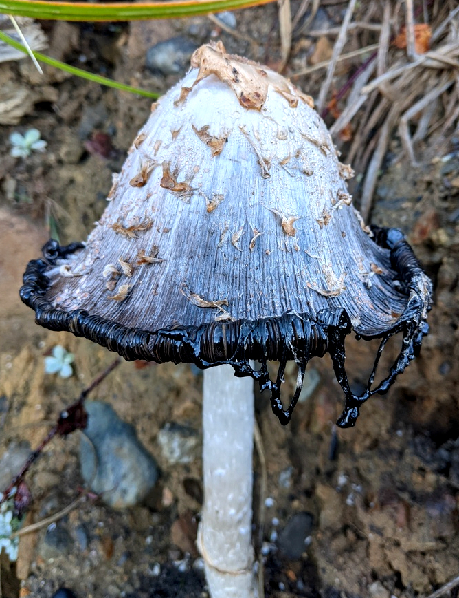 When young this mushroom is like a giant long oval egg with lots of shaggy scales. But as it becomes a classic mushroom shape, the cap liquifies into a black inky substance as the margin curls inward.