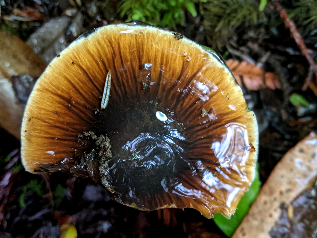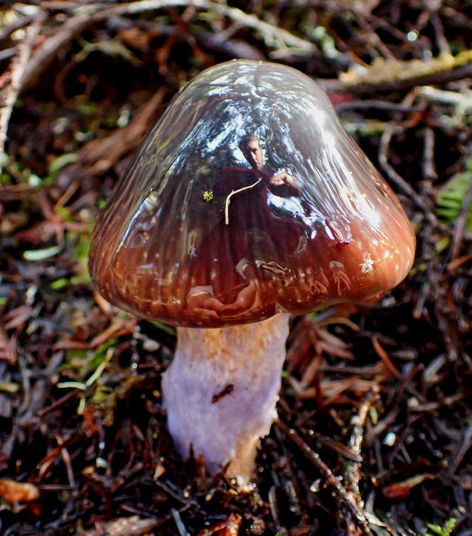 Uhh, freakin fabulous! This slimy colorful mushy is a trail stopper. One you have to stop on whatever trail you’re on and marvel at. The cap. Those dark chestnut-y brown spreads its striations towards the lighter colored edge all underneath a thick layer of glutinous slime. The stipe. Lilac to light lavender tones are quite striking against the conifer duff. Eventually the stipe melts away to a white base color. Stunning!
