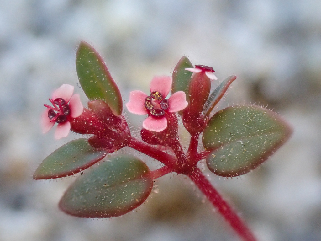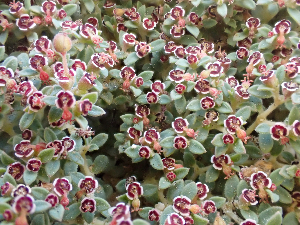 Red-gland Spurge, Euphorbia melanadenia This perennial herb forms a nice little clump of cuteness in the ground like other Euphorbias. The red stems are quite nice with wooly oval-shaped leaves protruding all over. The cynthia, technically are pretty tiny, about two millimeters wide. Ya got to get nice and close to view these beauties. The shiny red jelly beans are glands at the top part of the structure just underneath the reddish styles which are female parts.