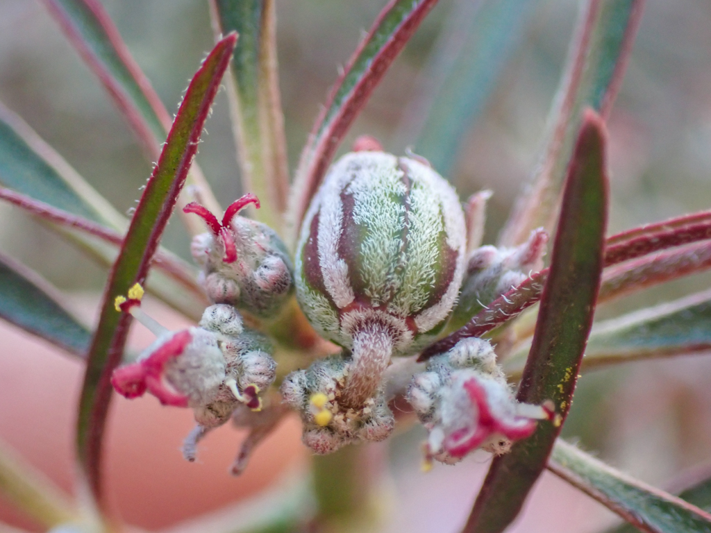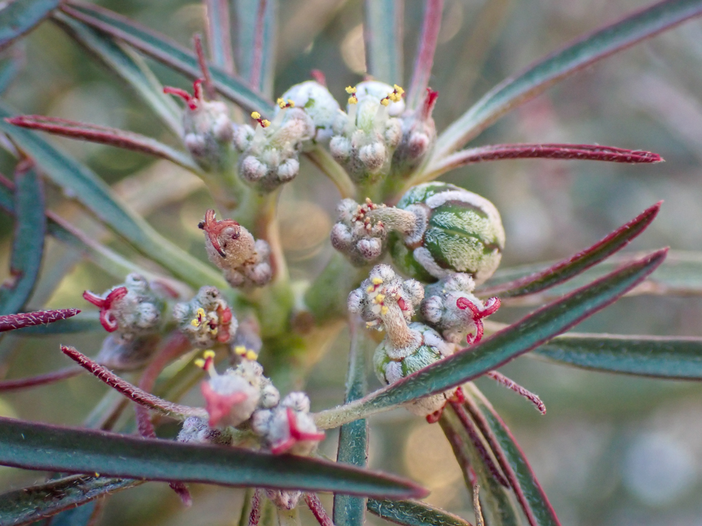The inflorescence is few to many in cyme-like clusters at the end of branches. The cup shaped involucre has one to three glands. Both the involucre and fruit is hairy. But as you’ll see in the photo the involucre is without any petal-like appendages. Odd looking plant for sure! Doesn’t the ovary look like a tiny watermelon?!