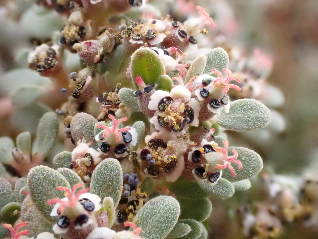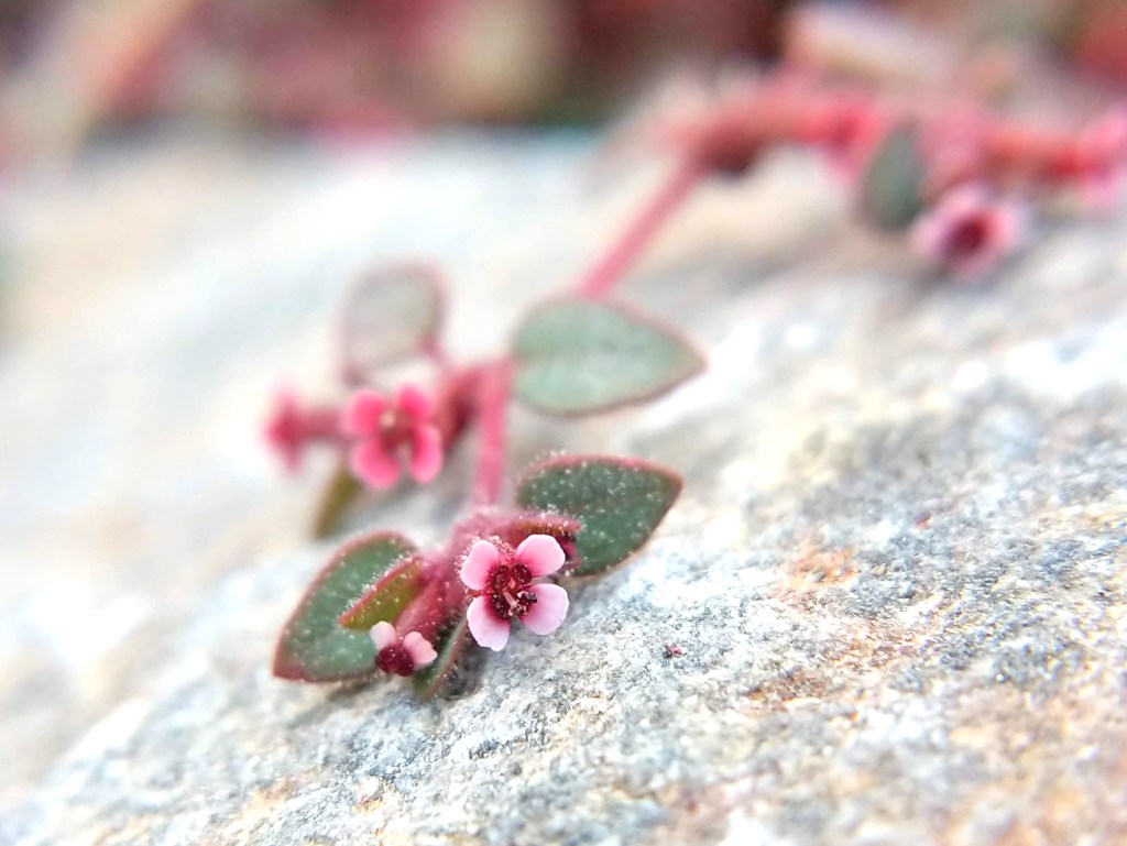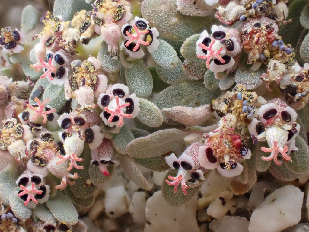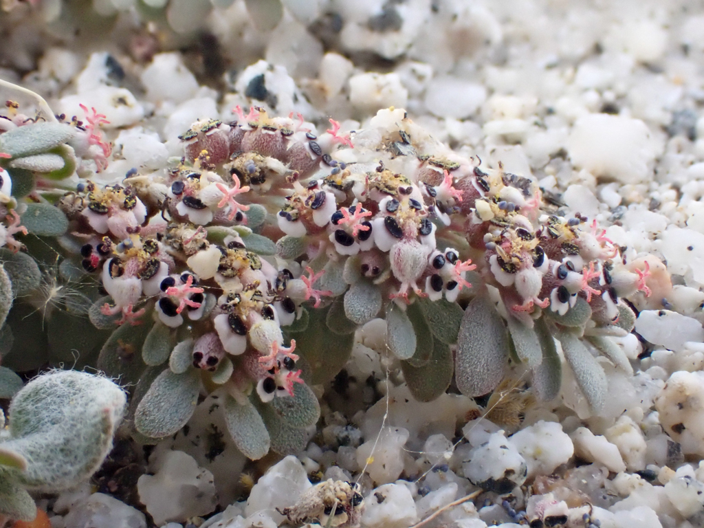 The Carrizo Mountain Sandmat, Euphorbia pediculifera has a gorgeous contrast of pink styles (female part), dark glands, and sage green leaves. While little information is known about the pollinators or others that utilizes sandmats due to their tiny-ness but this plant supports the belly of the Straight-lined Wave Moth, Lobocleta plemyraria . Growing very low to the ground this perennial only grows up to about 8 inches. Female flowers seen with the pink tubes radiating out from the center is surrounded by male flowers with the yellow fluffy pollen or light purpley-blue round apparatuses. Just lovely!