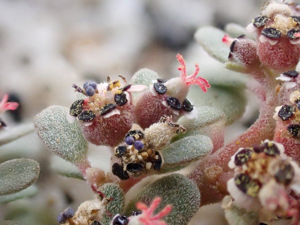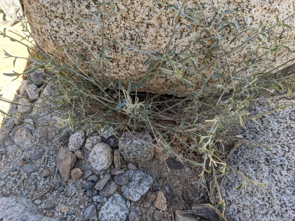Genus Ditaxis have alternate leaves, with a more or less open inflorescence not enclosed by the non-flower-like involucre and are unisexual. The stem and leaf hairs are twice branched, or none at all, and Ditaxis have smooth seeds. As you can see these have a more recognizable flower, but still challenging to spot when walking through a desert wash.