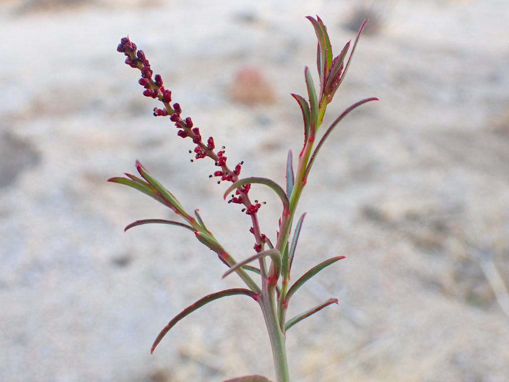 Narrow-leaved Stillingia, Stillingia linearifolia. Another great looking spurge! Within the inflorescence are stalked glands positioned on the pistillate bracts. This monoecious plant has male flower parts above the female, but you won’t find any petals on this long erect spike. The pistillate flowers are well separated and there are about three to six per inflorescence. As you can see in the photo the leaves are very narrow, only about 2mm in width. Teeny Tiny!