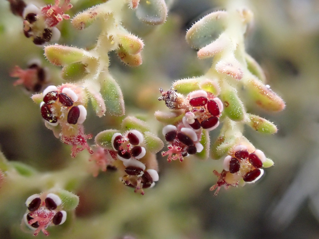 Tiny would be one way to describe their flowers, not the smallest I’ve seen, but small enough to have a tough time deciphering the flower structure. A female flower has a single pistil, whereas the male flowers have one to ten (or more) stamens. But these are not true flowers, n botany they are called cynthia. Both sexes can be found on a single plant (monoecious) or separately (dioecious). ‘