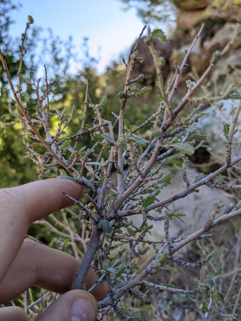The last plant for this post is the Western Bernardia, Bernardia incana. While we didn’t find a blooming plant, its structure is still really neat looking! The big structure you see that’s broken into three parts is the fruit. This plant has a staminate and pistillate flower with 12 to 15 stamens and 5 sepals respectively. You can find this native plant in washes and rocky canyons in Southern California, Texas and Mexico.
