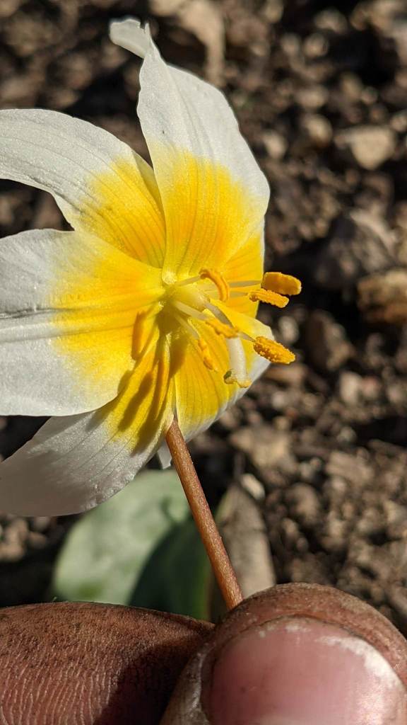 Oooo aren’t those mottled green leaves just gorgeous!? The name Fawn Lilly comes from the resemblance to a deer fawn’s coat. From the base the flower can be up to 30 cm tall with one to three flowers. What would normally be petals the white structures with yellow bases are tepals (flower terminology for who the eff knows if its a petal or sepal).