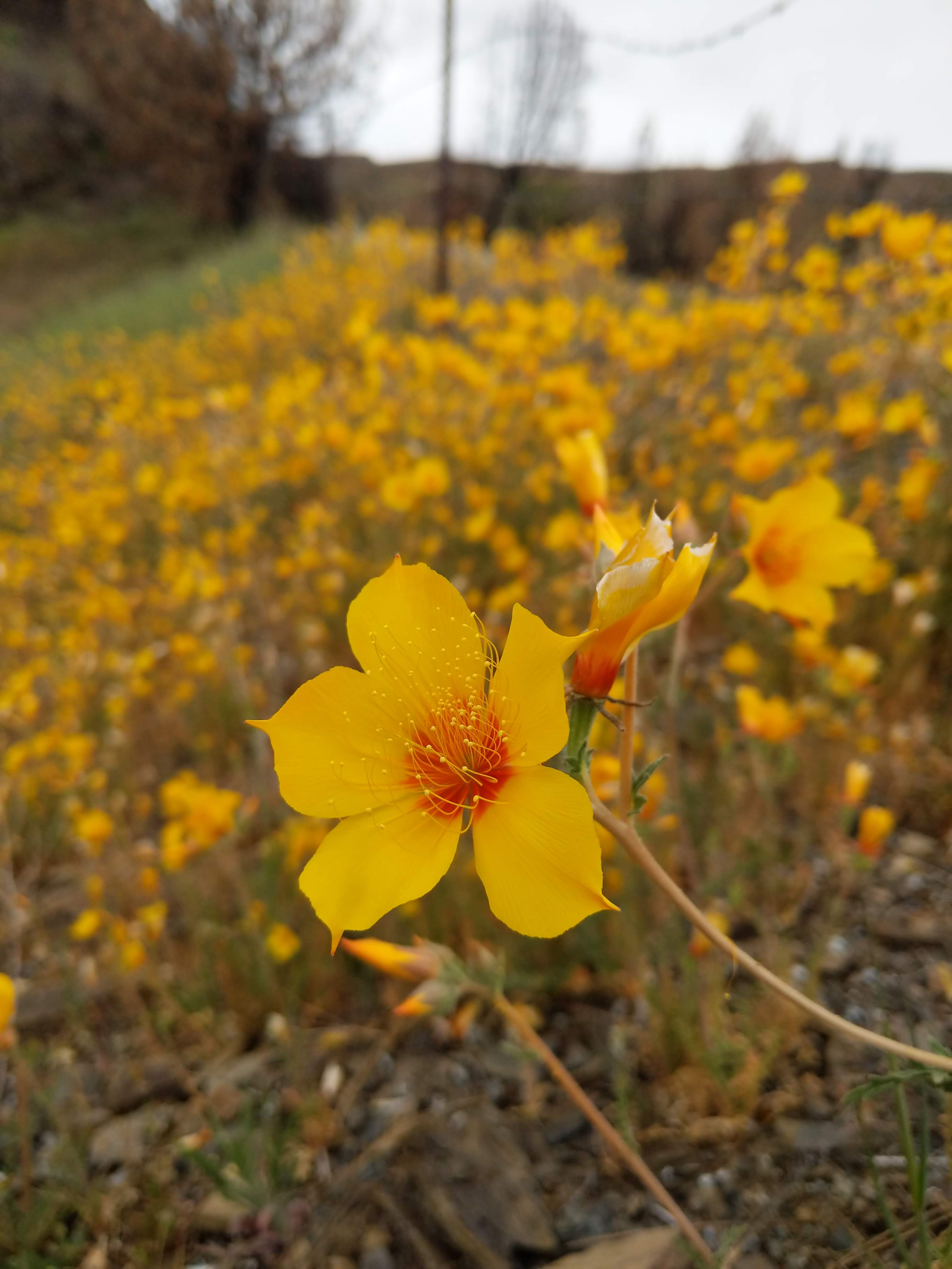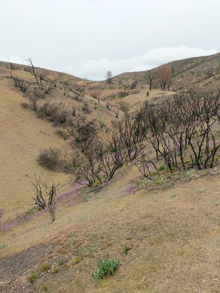 So what about wildflowers? Similar to some pine trees, such as the Monterey or Knobcone pine which have adapted cones that require fire to melt the resin away – unleashing the seeds – some wildflowers have similar adaptations. Some wildflowers will only appear after a fire has come through, such as the fire poppy, a strict wildfire follower you could say. We’ve searched for both the wind and fire poppy which can appear together after a fire but have come up empty this year. But others appear shortly after a fire but widespread in non-fire altered landscapes too. From what I can gather there is no strict categorization of fire-followers versus kinda/sort-of/maybe fire followers. Like a lot of things in nature, strict labels don’t always jibe. Even with a lot of unanswered questions, I poked around to see what I could learn about a few of my favorite “fire following flowers.” So here is a small write-up about five different flowers found in recently burned areas and the associated stories of finding them. Enjoy!