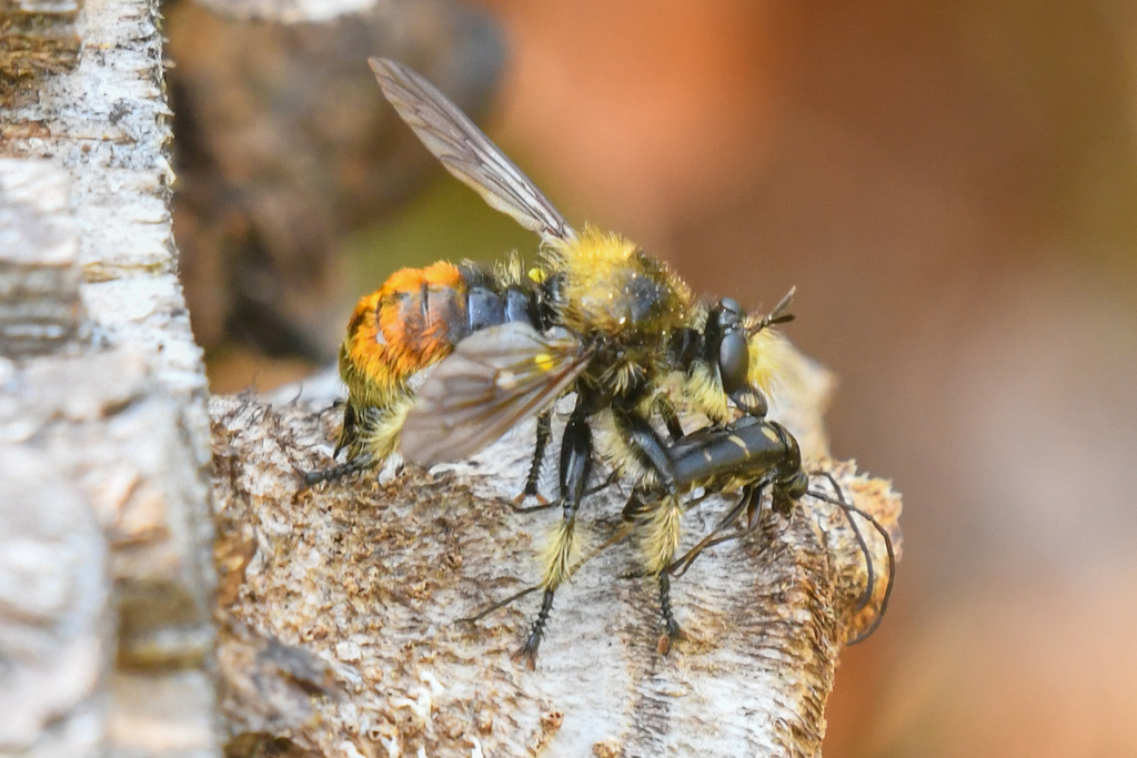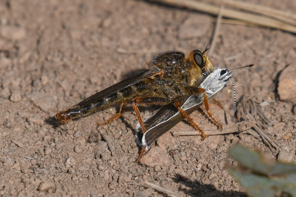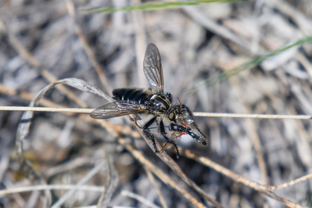 Speaking of meal time. . . . Most Asilidae will capture and chomp on any insect of devorable size, but some specialize in a particular prey. Opportunistic, non-selective, and generalist are good descriptors of their foraging style. Prey preference is reflected in their body shape, from slender to bulky, all evolution at work. A paper on Neotropical Robber Flies describes in more detail their feeding and foraging behavior, which I assume would be similar to those in British Columbia. Researchers describe flies being quite the greedy feeders and will forget about a smaller prey and exchange for another. Even if they have secured a prey they will continually search for more. “Attack” and “relocation” flights are noticeably different, which I’ve observed in the field. Shelley’s 1984 paper describes what others have also found, that when going for prey the fly takes off rapidly to a specific point, and then returns to its initial spot. Whereas relocation flights are slower and indeterminate in direction. A mixture of the two flights can occur, like grabbing a to-go-meal with a leisurely drive before and after.
