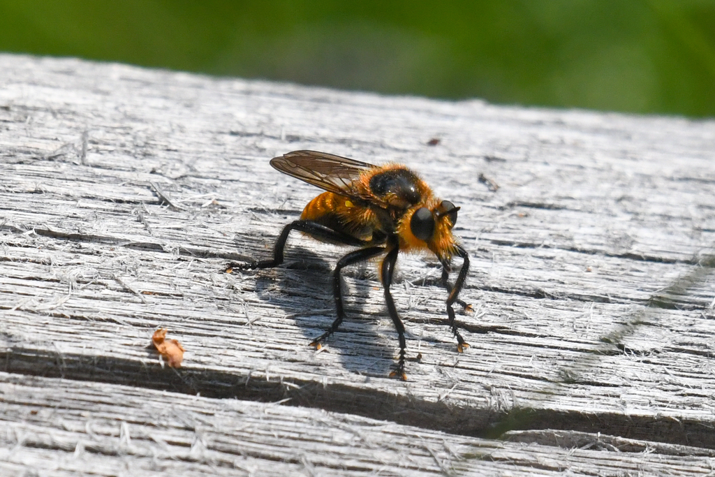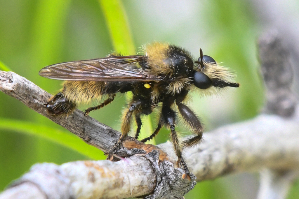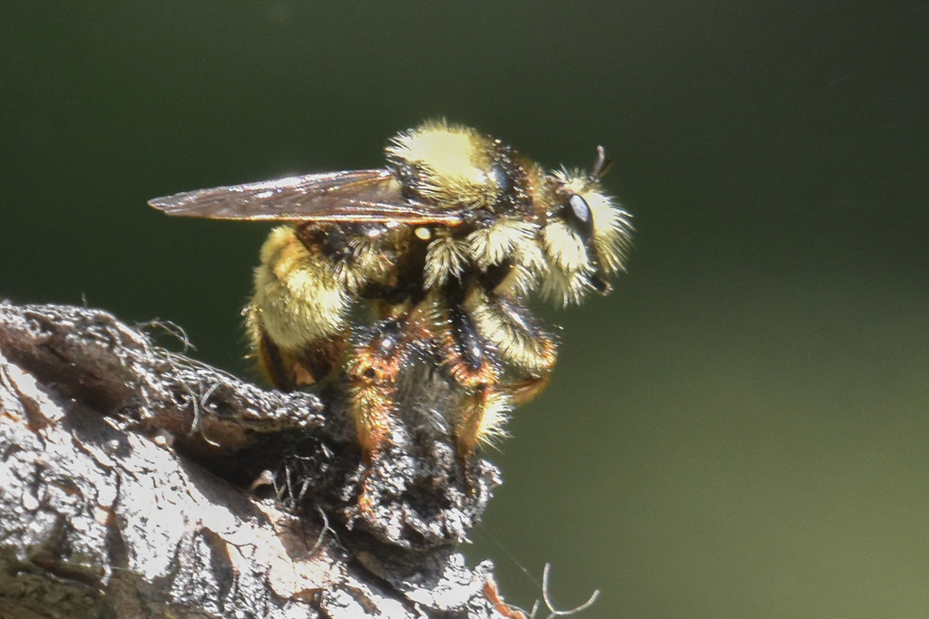 For a little highlight, one of our favorite genera is Laphria. The Genus Laphria are known as the “Bee-like” Asilidae, and have a Holaratic distribution. As a bee-mimic they usually have some fabulous yellow and black markings and quite the hairy little dudes. Because their eyes are fixed their mobile neck allows them to twist their head in order to align the front areas of their eyes to be at right angles to their line of sight according to Bullinghton’s Laphriini.com. I noticed this recently on a fly that was perched but continuously moved its head back and forth like a little bobble head.