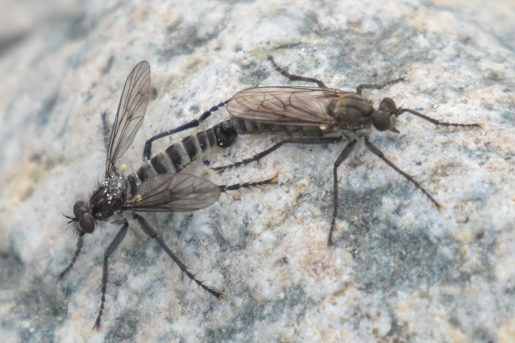 So how do we come across these fabulous flies? After many hours on hot trails watching and photographing these buggers it’s nice to read in the literature a confirmation of what we’ve observed. Around here in Southwest BC they are most active during the hottest part of the day in open areas with lots of light. When we come across an area with lots of windfall, logs, branches, anything that offers a great perch to ambush any nearby flying prey it’s time to stop and look at the logs. While old logs are very reliable spots to look for us, they also perch on branches, the ground, or vertically on plant stems. This combined with an open canopy, allowing lots of light to hit the forest floor is a perfect spot to watch for them. I think because we had chaotic thundering weather for days during this recent backpacking trip the moment the glorious rays of sun broke through the Robber flies went bananas and would take advantage of the high temps before the dark clouds released precipitation.