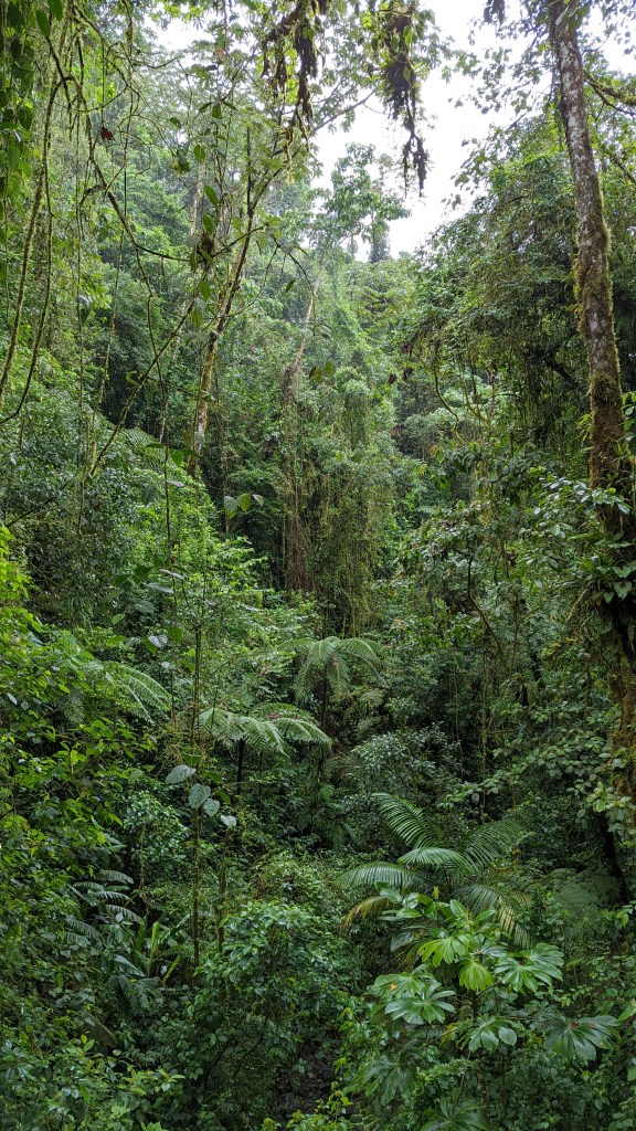 After a long day exploring the canopy bridges and trails of Sky Adventures–Monteverde Park for birds, orchids, and insects, with hilarious and knowledgeable guide Adrian Mendez. We already had an amazing day, totally tuckered out, when we were startled by some movement beneath the bridge. Hmmm who could it be? Well, some scuttering, some gasping, and then a final swoop of some feathers revealed a Resplendent Quetzal! WHA! He sat out in the open, essentially eye level to us about 20-ish feet away, tail flowing so graciously downwards into the canopy leaves. Wow, what a sight! Besides being arguably one of the most beautiful birds on the planet, this species is on the list of any birder who comes to the region. We had an incredibly full day already, but this sight was the absolute cherry on top, we couldn’t believe we both got such an incredibly clear view, which lasted a long time for a bird sighting, but not forever, as it swooped down into the greenery, not to be seen again by our eyeballs.