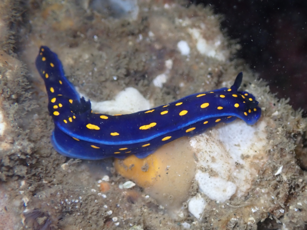 BLUE! BLUE! The California Chromodorid was an exciting fine, and a this individual was a very small one. tThey can grow up to 9cm (3.5 inches), but this one was round 2-3cm long! This nudibranch lives from Monterey Bay down to the Baja. It became regionally extinct in the northern part of its range and disappeared completely from California by 1984. THANKFULLY it reappeared in 2003 and is now found reliably in multiple places in Southern California. On iNaturalist, there was a total break in observations from 1992 to 2006.