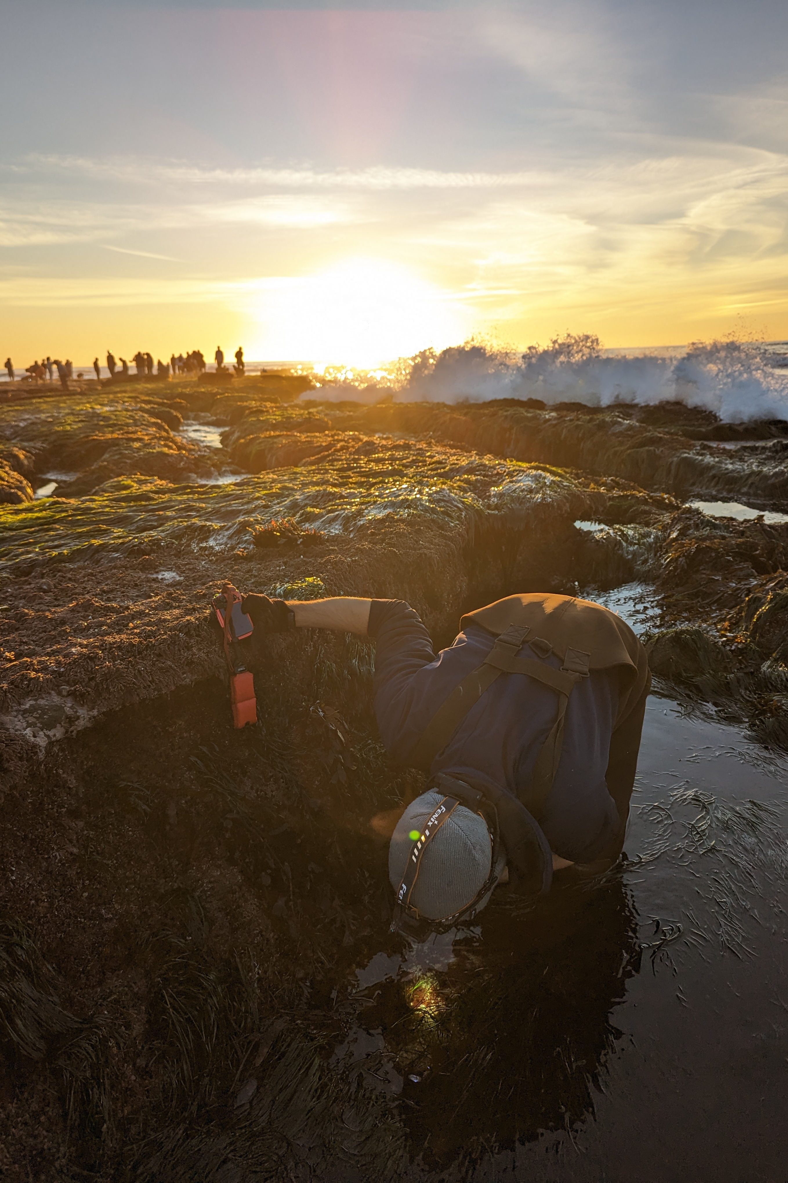 Trevor tidepooling at La Jolla Tidepools, at sunset and a large crowd in the background.